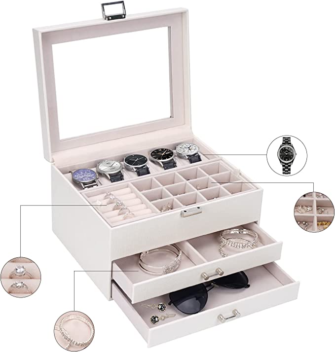- Compartments for watches, rings, chains, earrings, and drawers for larger pieces