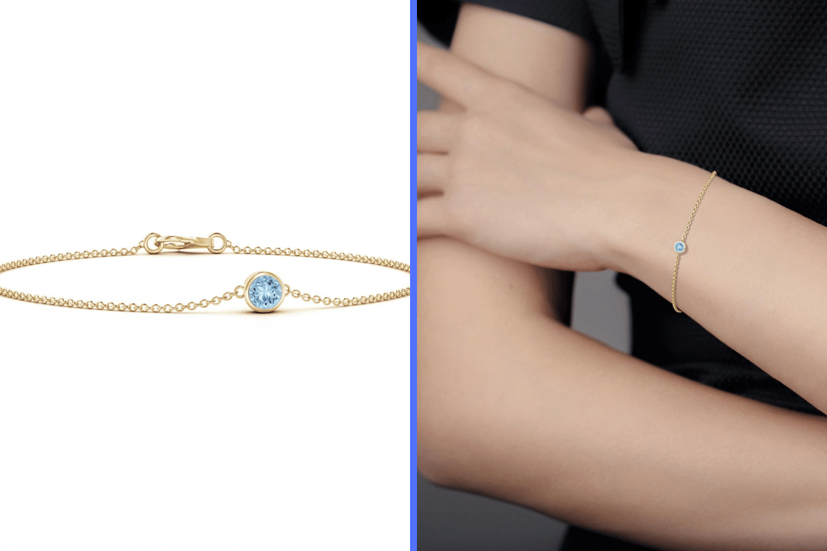 The combination of 14K yellow gold and the beautiful aquamarine stone creates a look that is perfect for any occasion. Plus, it’s free shipping and returns, which is always a plus! Tap HERE to order the Bezel-Set Round Aquamarine Chain Bracelet now!