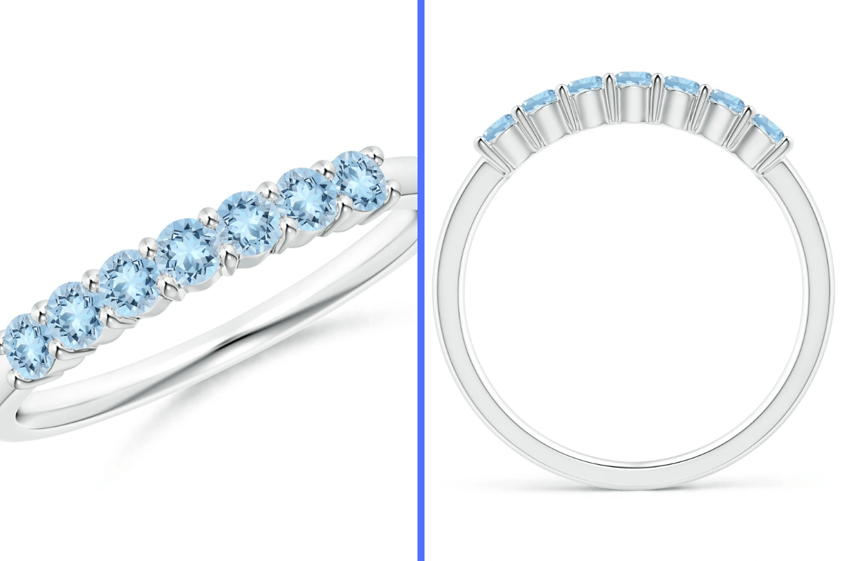 Featuring a glistening 14k white gold band, this Half Eternity Seven Stone Aquamarine Band is a stunning piece of jewelry. Whether you're looking for an anniversary gift, a wedding band, or a stacking ring, this is a perfect choice. The seven round aquamarines are held in a prong setting and have true appeal with their pastel blue color. Plus, this band comes with a Certificate of Authenticity from Angara to ensure its quality and beauty. These aquamarines are "Best" quality, higher color saturation and larger stones (total carat weight) are also available.