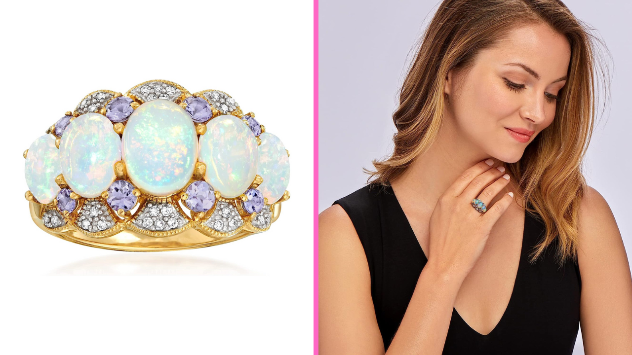 Ross-Simons Ethiopian Opal and Tanzanite Ring is a stunning piece of opal jewelry that any woman would treasure. This gorgeous 14kt yellow gold ring features 5 white opals, 8 tanzanite, and 30 diamond accent stones. The beautiful colors of the opal, tanzanite, and diamond accents pair perfectly together to create an eye-catching statement piece. The polished 14kt yellow gold setting adds to the luxury of the design. Sizes available, 5-9.