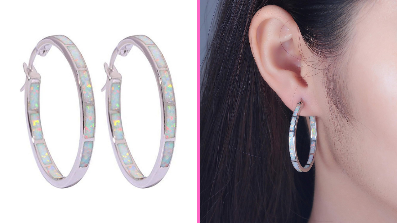 These CiNily Opal Hoop Earrings are one of our most favorite pieces we've ever found on Amazon and an excellent choice for anyone looking for reasonably priced opal jewelry! They feature a classic, trendy, and delicate design and are crafted with stunning, highest-grade cut opal stones. The good quality earrings have a high-polish finish, a length is 32mm, the width is 3mm and weighs 8.17g/pair. Plus, the white opal inside-out design makes them a truly unique and eye-catching piece. The earrings also come with a high-grade rhodium finish to protect against tarnishing and they are lead-free and hypoallergenic, so they should not cause skin irritation.