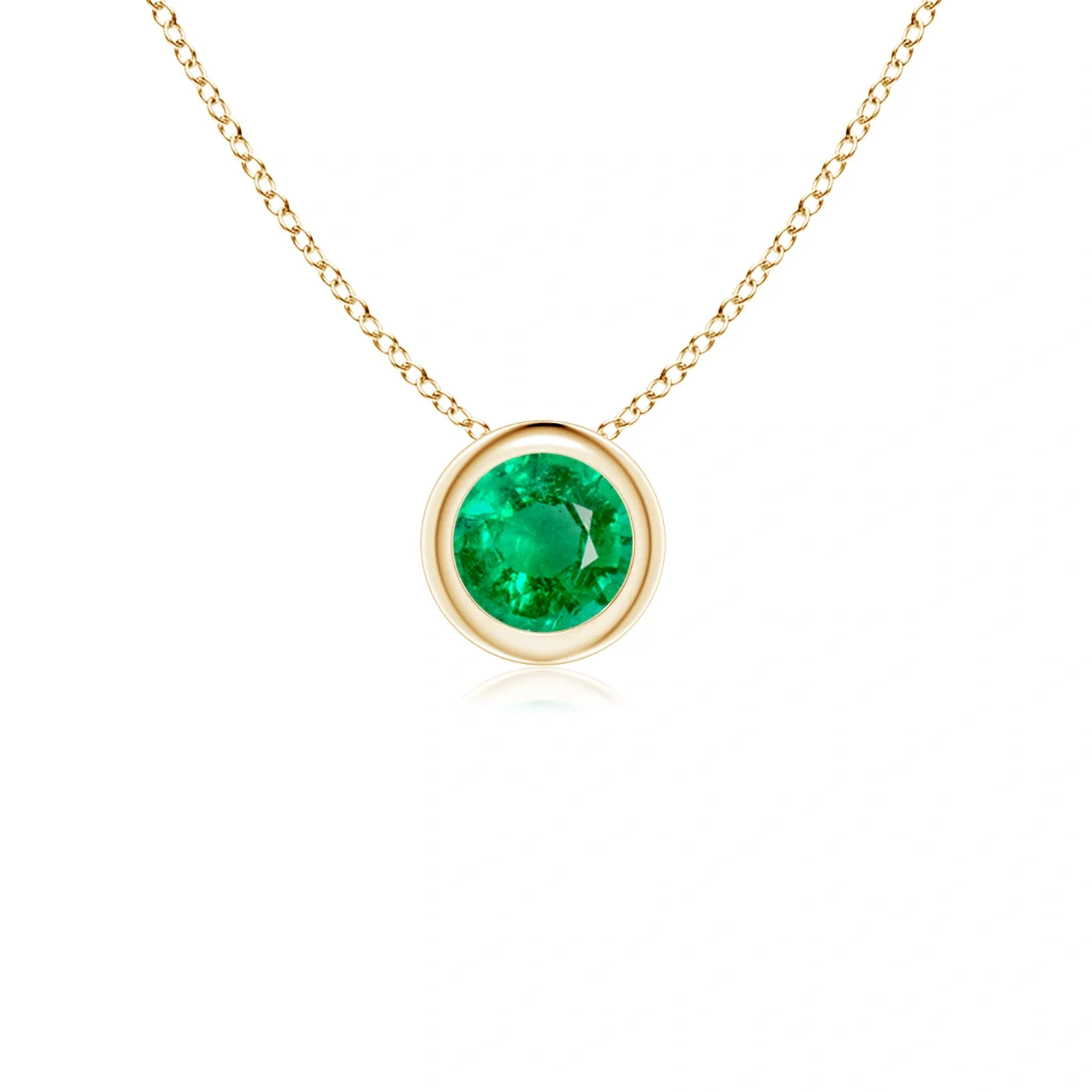 The Bezel-Set Round Emerald Solitaire Pendant from Angara is a stunning piece of jewelry that is perfect for anyone who loves emeralds. The lush green emerald is set in a 14k yellow gold bezel setting that makes the center stone appear like it’s floating on the chain. It’s a classic solitaire design that is simple yet gorgeous. The pendant also comes with a certificate of authenticity so you can be sure of the quality. Emerald size options: 0.24-1.75 carats. Available in white, yellow or rose 14K gold, or platinum.