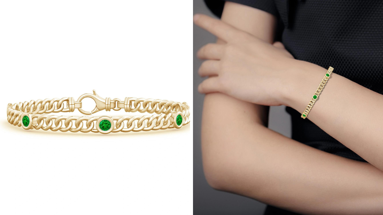 This emerald station bracelet in 14k yellow gold is the perfect accessory to add a touch of luxury and style. The bezel set round emeralds captivate with their lush green exuberance and the curb chain link bracelet makes for a versatile jewelry piece. Secured with a lobster clasp for extra security, this stunning bracelet is sure to turn heads no matter where you go!