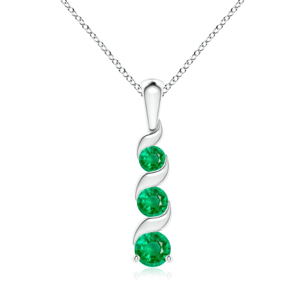 The Channel-Set Round Emerald Three-Stone Journey Pendant is a special piece of jewelry for anyone who loves emeralds at a great price. This gorgeous pendant is set in an exquisite journey trail of three graduating round emeralds with a lush green hue, all channel set in 14k white gold with a lustrous bale. For quality assurance, each pendant comes with a Certificate of Authenticity.