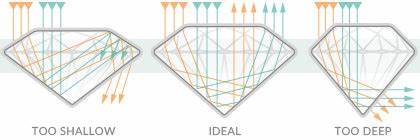 If a diamond is poorly cut, too deep or too shallow, light will leak out the pavilion making the diamond appear dark or gray. The pavilion of the diamond on the right has a pavilion that is cut too deep, on the left, too shallow.