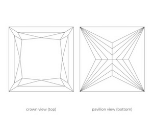 Princess cuts are perfectly square diamonds; the length to width ratio should be 1:00-1:00 or can be slightly above that, e.g. 1:00-1:05. This cut features kite and triangular shaped facets.