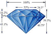 The proportions are the relationships between the sizes of a stone’s various parts and angles. They are important in terms of the stone’s overall beauty, since they, more than anything else, determine the extent to which the stone can achieve its maximum potential in terms of its reflection of light, which translates into beauty.