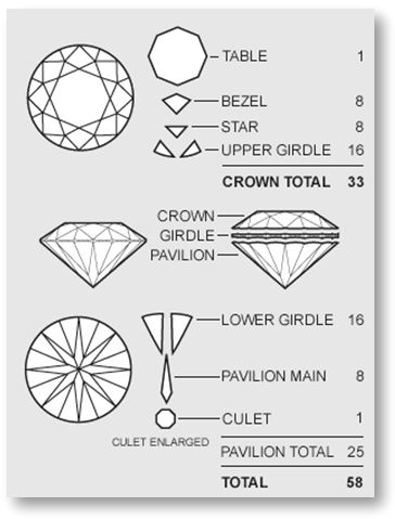 1.) The overall shape: (e.g., round or marquise, etc.) and the facet arrangement; step-cut, brilliant cut, or mixed cut, a combination of brilliant cut facets and step cut facets.