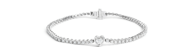 Ben Bridge Diamond Line Bracelet: Nothing dazzles like a diamond tennis bracelet, especially one made with stunning 18k white gold and sparkling diamonds. This captivating bracelet is made using 1.28 carats of bezel-set round brilliant cut diamonds with a dazzling heart-shaped diamond centerpiece. Fiery diamonds create enduring elegance, while perfectly crafted bezel settings protect these precious stones so you can enjoy them for a lifetime of style.