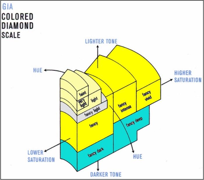 The Gemological Institute of America (GIA) grades fancy colored diamonds based on three attributes: hue (the actual color), tone (the relative lightness or darkness), and saturation (the color's strength or intensity). (See the chart of the grading scale above.)