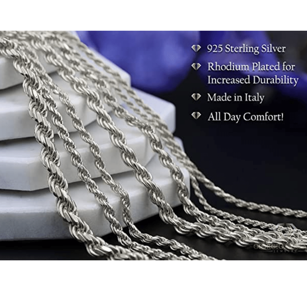 Gorgeous 925 Sterling Silver rope chains. These chains are rhodium plated for added durability and tarnish protection. Choose from a delicate 1mm width up to 5.5mm. Available in 16-30 inches long; and 9 inch matching bracelets. The diamond cut design reflects the light with every movement. For a closer look at the available options, click below.
