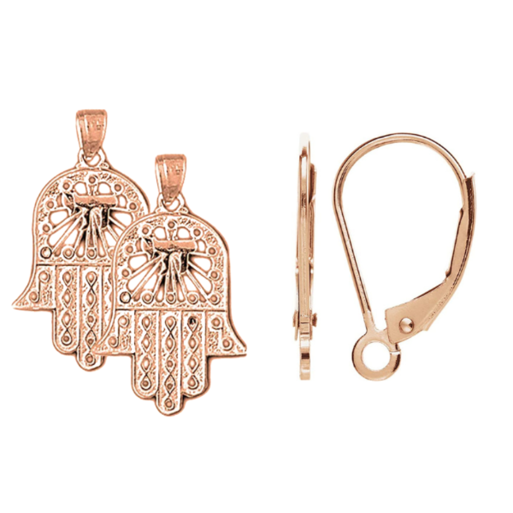Jewels Obsession Hamsa Earrings | 14K Rose Gold Hamsa with lever backs are the perfect accessory for Hamsa jewelry lovers! These beautiful earrings are crafted in 14K Rose Gold and feature a beautiful Hamsa symbol with a Chai sign. It is also stamped 14K to ensure its gold fineness and comes with a 30-day money-back guarantee.