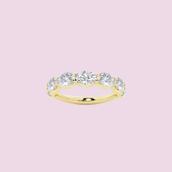 The 2-Carat TW Oval Lab Grown Diamond East-West Anniversary Band is a chic and timeless accessory for anyone who loves something a little different. Its radiant row of horizontally set lab-grown oval diamonds provides an extended shine that just won't quit. Crafted from 14K yellow gold (and available in platinum, white or rose 14K gold.) This stunning band is sure to make a lasting impression. Style it solo or make it the base of an eye-catching stack; this oval diamond band will always look incredible.