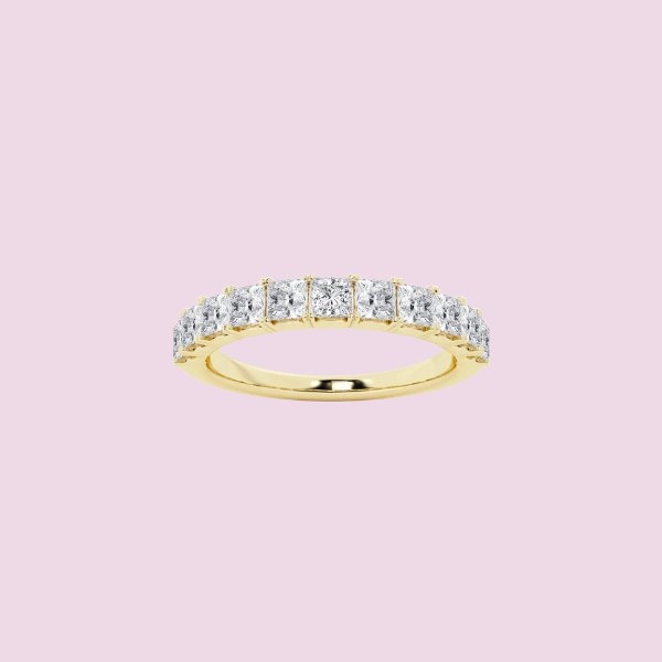 "This ring is fit for a queen" will be the message that this stunning 1-carat TW Princess-cut Lab Grown Diamond will send. The princess-cut diamond is one of the most popular diamond shapes because it sparkles like no other. This ring is 14K yellow gold but is also crafted in platinum, white, or rose gold. The diamonds are colorless and near-colorless (F-G). It has an excellent to very good cut grade. The clarity is SI1 or better. With 11 diamonds and a total carat weight of 1.00, this band is sure to make your beloved feel truly special.
