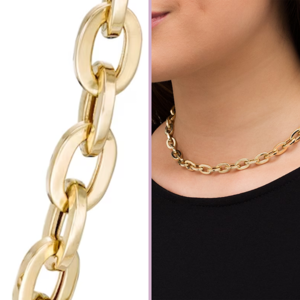 This is a trendy 10K gold (not gold plated) link chain choker with hollow oval-shaped links that is easy to wear. It is 7.0mm wide, 14.0 inches long and has a 2.0-inch extender. The choker necklace comes with a spring-ring clasp and has a bright polish. If you prefer a more conservative look, this is a great eye-catching, stand-alone piece too.