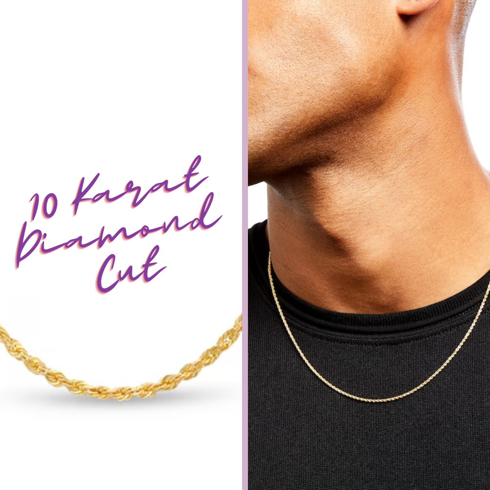 This 1.5mm-wide diamond-cut glitter rope chain necklace fashioned in 10K gold measures 20.0 inches and is the perfect chain for men or women. The unique diamond-cut design catches and reflects light just like diamonds. Worn alone, or layered with other chains, it will stand out from the rest.