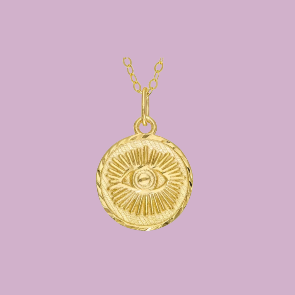 Add some luck and protection to your day with this captivating medallion pendant. The pendant is made of 10K gold and measures 10.0mm in width. It features a textured disc with a sculpted evil eye design at the center and a diamond-cut texture along the border for a stunning finish. The pendant hangs on an 18.0-inch cable chain with a spring-ring clasp. It has a brilliant luster.