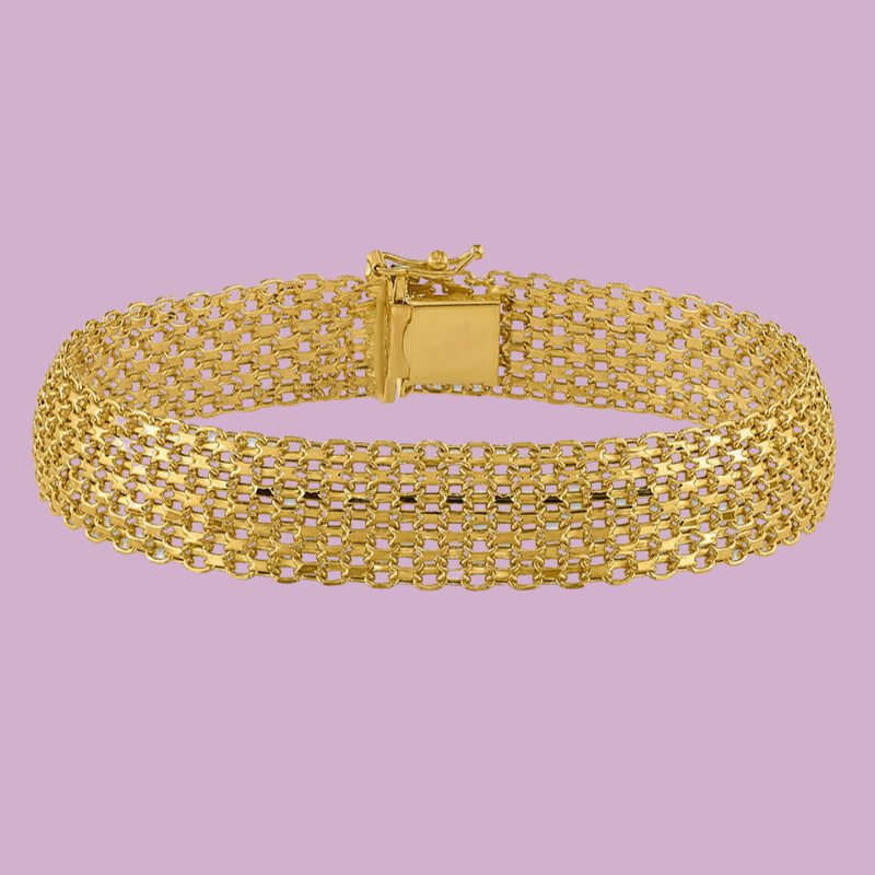 Add a touch of glamour to your outfit with this stunning link bracelet. Crafted from 14K gold, this captivating style is 10.2mm wide and features an intricate pattern of interlocking links that shimmer in the light. It is polished to a bright finish and measures 8.0 inches long, fastening with a secure fold-over clasp.