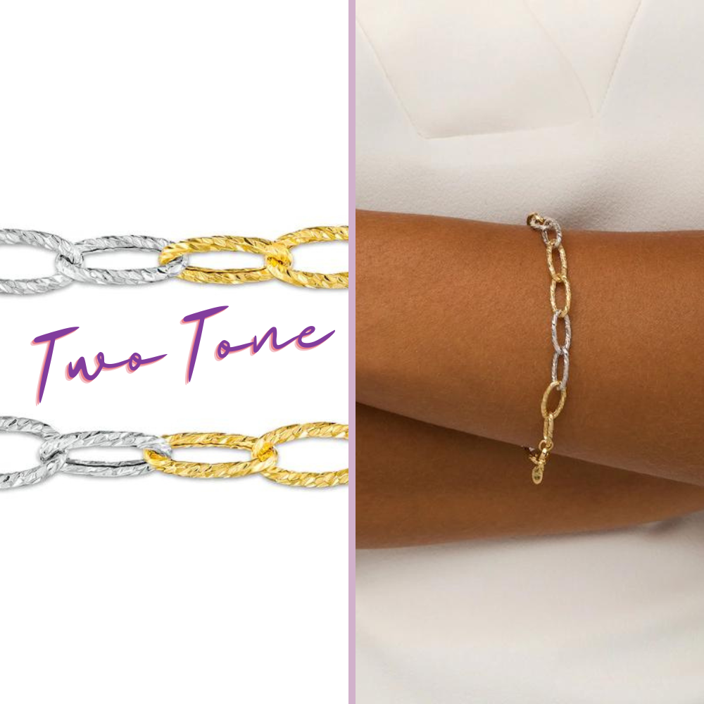 Enhance your look with the elegant Oro Diamante bracelet that features a two-toned diamond-cut paperclip link chain. The bracelet offers versatility and can be worn with rose gold as well as sterling silver, and platinum! This bracelet caters to any aesthetic taste and is great for everyday wear!