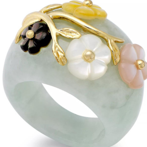 Jade and Multicolored Mother of Pearl (8mm) Flower Ring in 14k Gold over Sterling Silver