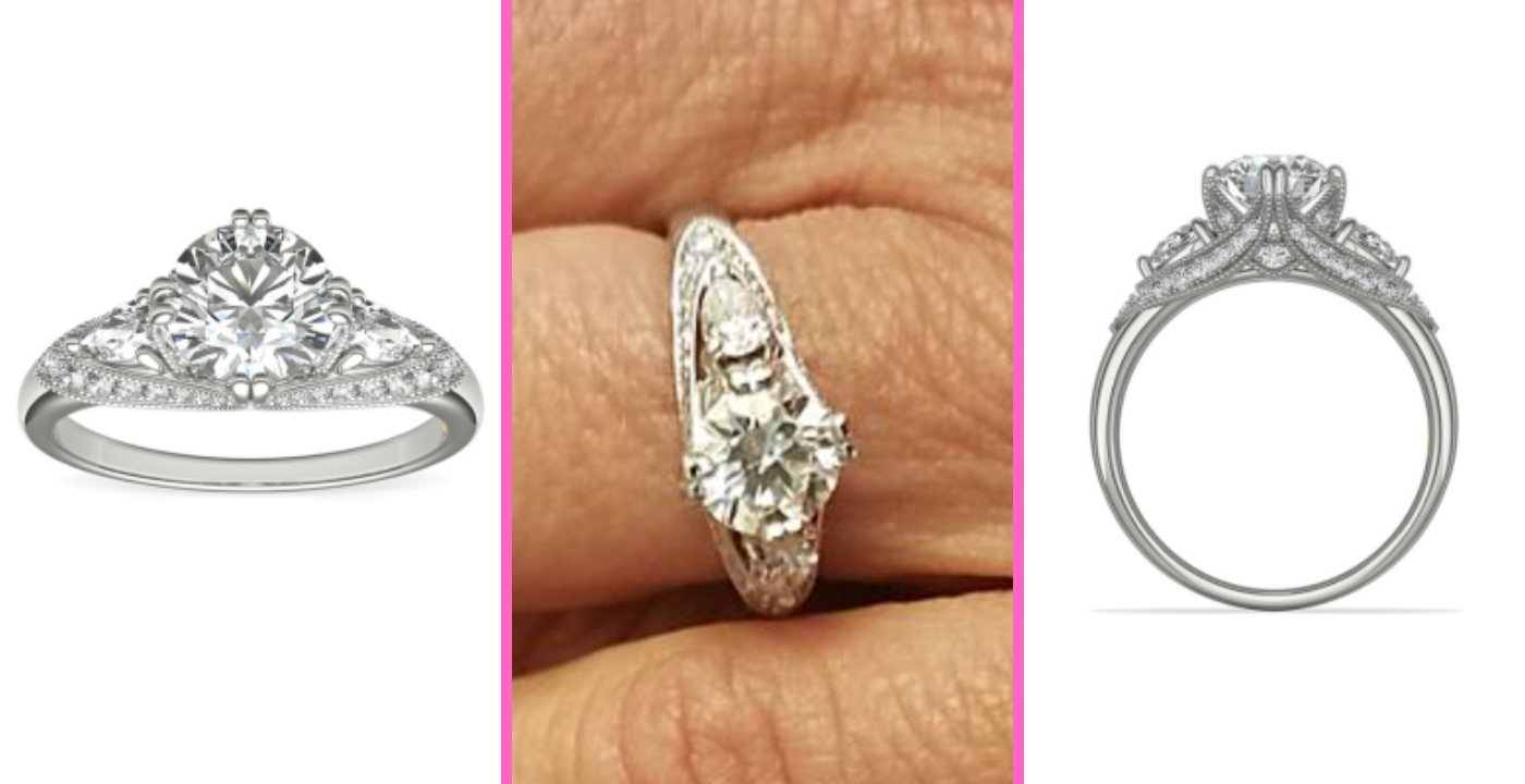 With its deco-inspired milgrain details and the stunning pear-cut diamonds, this ring will be cherished for years to come. The diamond carat weight of this ring is 0.54 carat total weight and has an average customer rating of 5 out of 5 stars with 23 reviews. Plus, you can select your center diamond to complete this ring. Also, take advantage of 12 months of special financing.