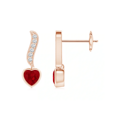 Make a statement with these beautiful Heart-Shaped Ruby and Diamond Swirl Drop Earrings from Angara. Crafted with 14k rose gold, this elegant pair of earrings feature two bezel-set heart rubies, enhanced with a push-back, suspended from diamond-paved swirl motifs. The beaming red gems and shimmering diamonds make this pair of earrings look absolutely stunning. Available in sterling silver, 14K yellow, rose, white gold, and platinum. Select from four qualities of ruby.