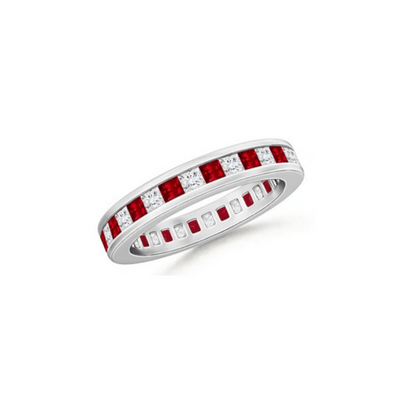 This Channel Set Square Ruby Diamond Eternity Wedding Band is a stunning symbol of love and commitment. The alternating square rubies and princess-cut white diamonds arranged in a full eternity setting are secured in a beautiful 14k white gold channel setting. With its exquisite craftsmanship and gorgeous gems, this ruby diamond eternity ring will make a timeless fashion statement.