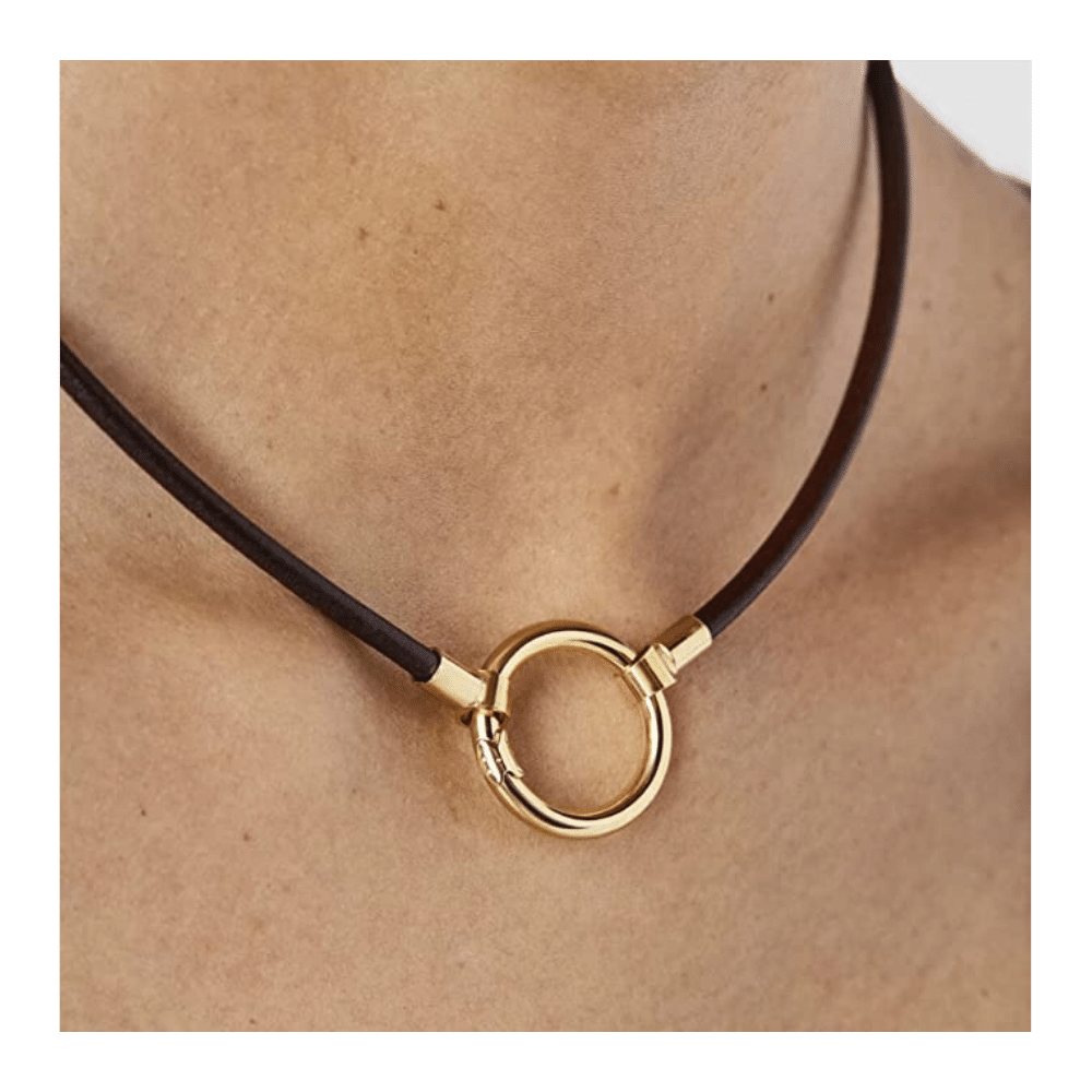 This fun casual necklace is a great gift idea. The ring is 925 sterling silver covered in 18K gold (vermeil); the design will bring a smile to anyone's face. The innovative clasp is completely integrated, easy to open and close and where additional rings can be added. The leather necklace is modern and young. Click below to see the many ways this necklace can be worn.
