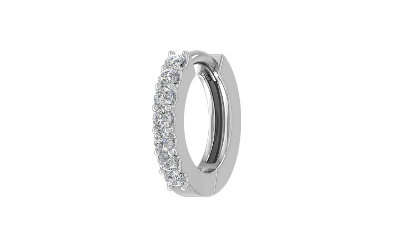 This is an absolutely gorgeous piece, set with seven natural diamonds in 14 Karat white gold. For those looking for a delicate nose ring with plenty of sparkle, this is it. A snug fit against the nose is comfortable, elegant, and perfect if you are looking for the brilliance of diamonds!