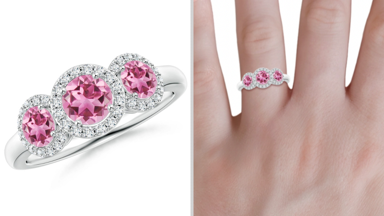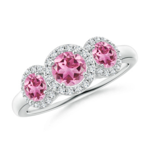 Tap the button above to order your gorgeous Round Pink Tourmaline Three-Stone Halo Ring with Diamonds today!