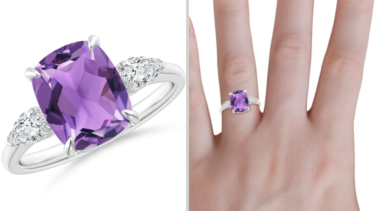 Tap the button above to see all the options for this stunning Cushion Amethyst Three Stone Ring with Diamonds!