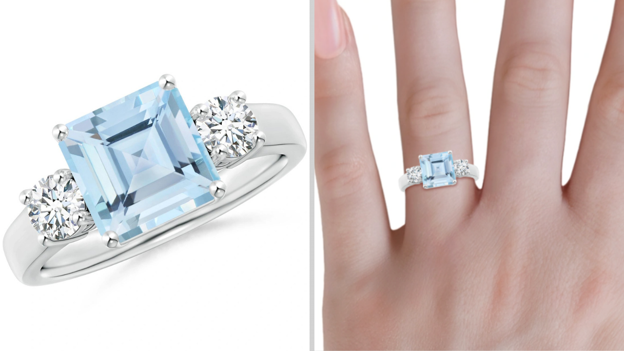 Cut is important as it affects how light reflects off the stone, so make sure to choose one with symmetrical facets and an overall beautiful shape. We love the unusual square shape of the stone in the three-stone ring we selected for our list!