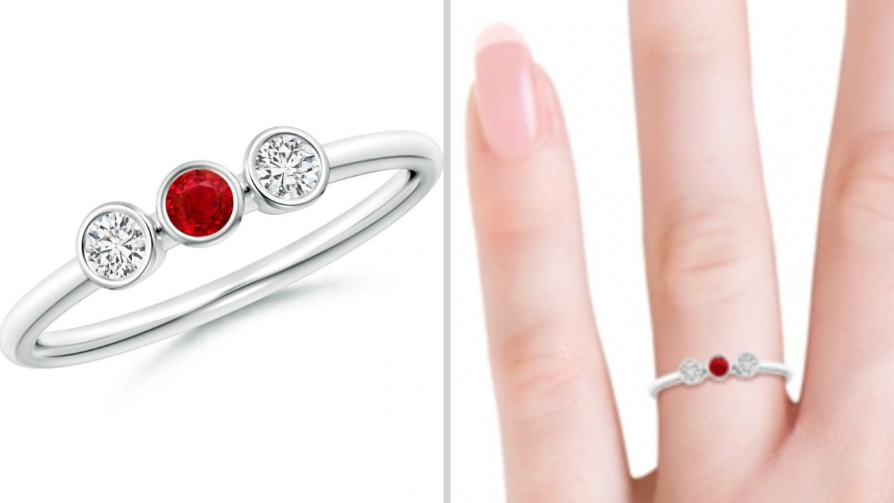 Tap the button above to order your own modern Bezel-Set Ruby and Diamond Three-Stone Ring today!